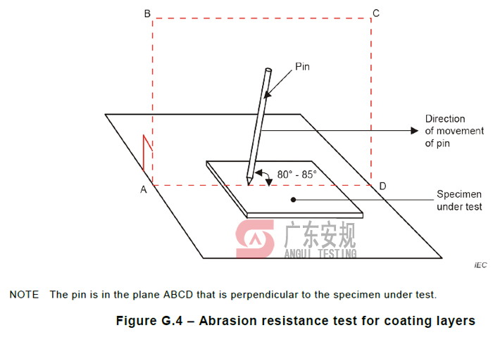 2、 根据IEC60950-1(GB4943.1) 2.10.8.4节及图2K要求,使用坚硬的,圆锥度为40º,倒角为0.25mm±0.02mm的钢针,以80º~85º的角度,施加10N±0.5N的压力,以20±5mm/s的速度滑行进行刮蹭,各道划痕间隔至少应为5mm,而且与样品边缘也应至少相距5mm。试验后,涂层不得松脱,也不得刺透,并在导线间经受抗电强度试验。